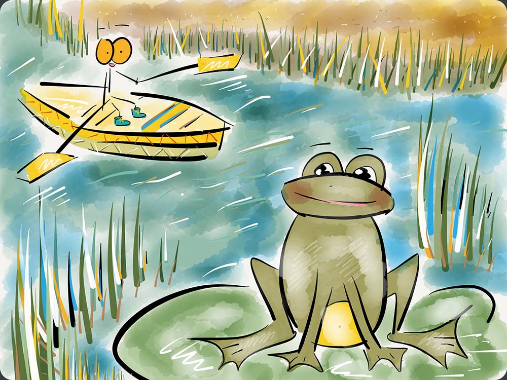 Suddenly, Marlon’s eyes caught a glimpse of something unusual on a lily pad. There sat a frog with the most infectious smile he had ever seen. Intrigued, Marlon steered his boat towards the lily pad to get a closer look.